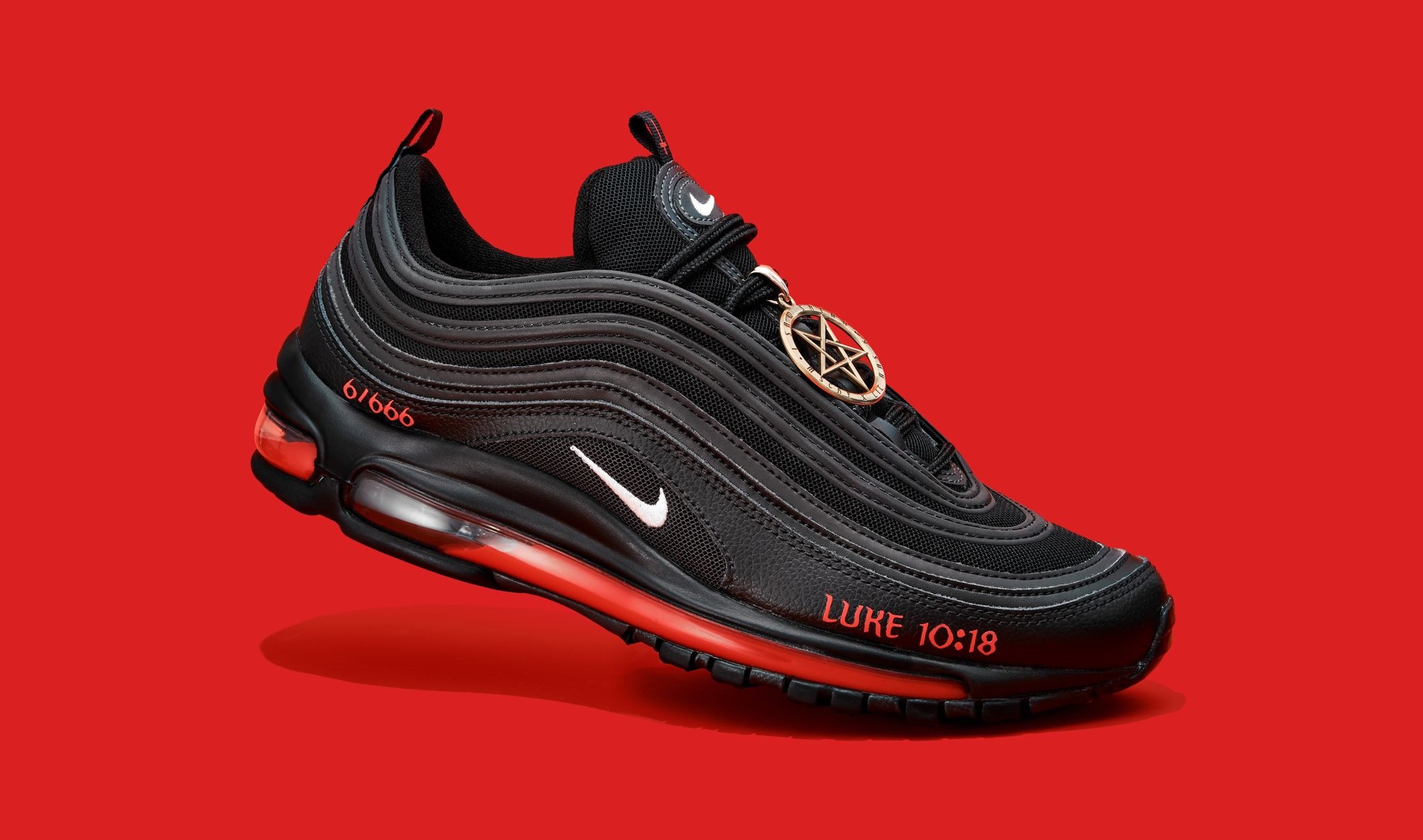 El controvertido par de "zapatillas de Satán" -que contienen una gota de sangre humana real en las suelas, además de una cruz invertida, un pentagrama y las palabras "Luke 10:18"- se fabricó a partir de un par de Nike Air Max 97 modificadas.