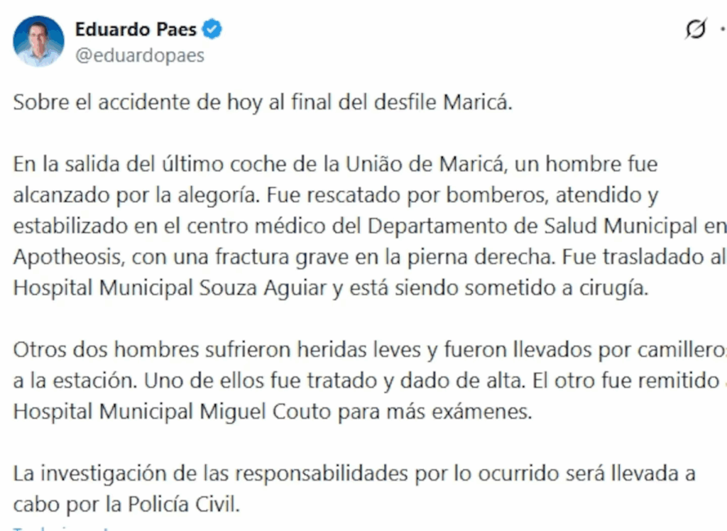 Por su parte, el alcalde de Río de Janeiro, Eduardo Paes, publicó un mensaje en su cuenta de X. Allí señaló que la investigación para determinar responsabilidades quedará a cargo de la Policía Civil.