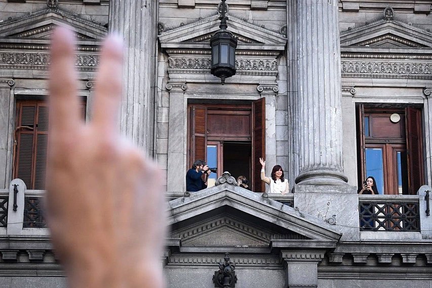 CFK salió al balcón del Congreso para agradecer el acompañamiento de cientos de personas