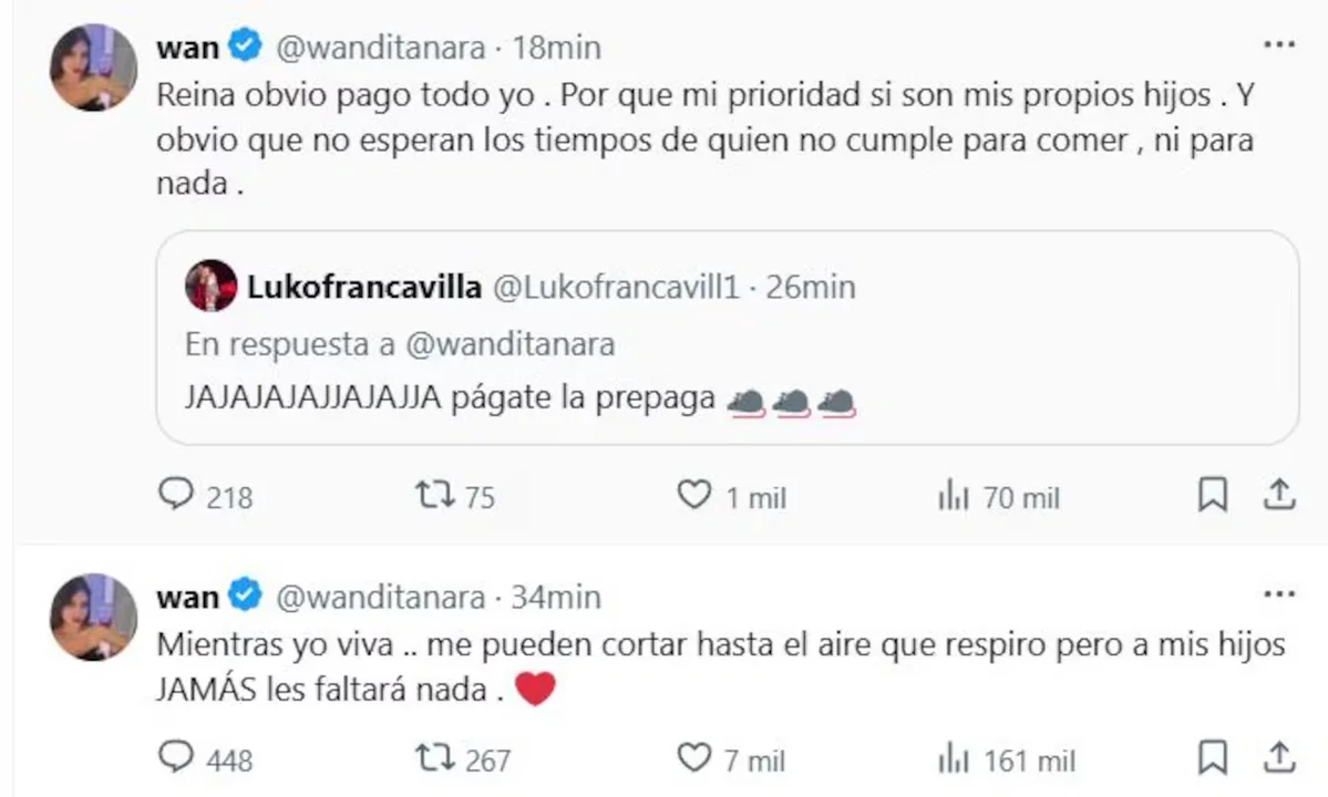 Además, Wanda se expresó en redes sociales frente a comentarios negativos que recibió de parte de usuarios que le cuestionaron el porqué no lo paga ella.