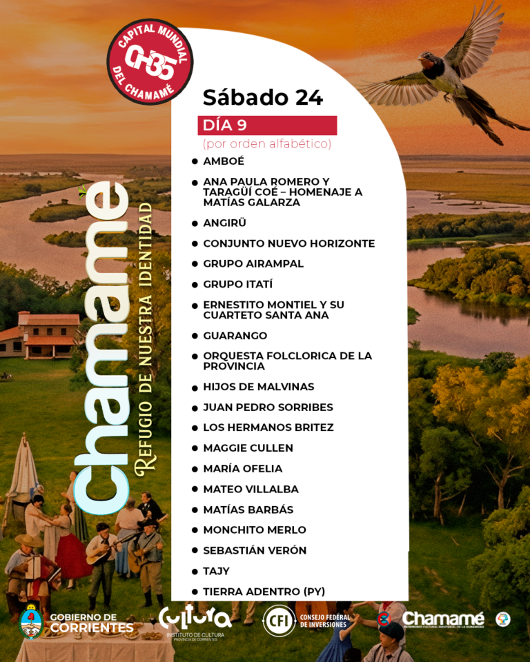 La Fiesta Nacional del Chamamé tendrá este Sábado 24 de enero su novena noche consecutiva en el Anfiteatro Mario del Tránsito Cocomarola, en la ciudad de Corrientes, en el marco de la 35ª edición del evento. Se destaca la presentación de Ernestito Montiel y su Cuarteto Santa Ana, Monchito Merlo y una gran lista de artistas.