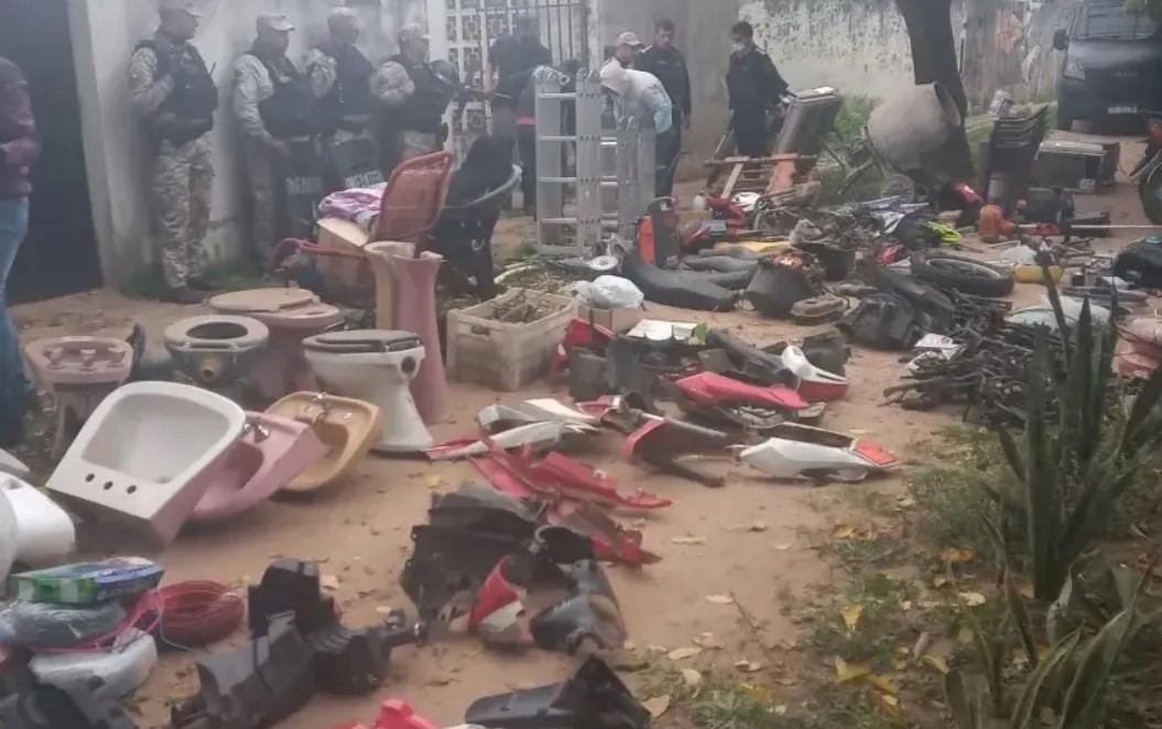 Además secuestraron gran cantidad de moto-partes y otros objetos de dudosa procedencia, como ser; ruedas de motos; moto partes; escaleras; palas; medidores de agua; una desmalezadora; inodoros; baterías de motos; horquillas de motos; llantas y amortiguadores de motos; caños de escapes de motos; una mezcladora para albañilería; dos aires acondicionados; sillas plásticas; entre otras cosas.