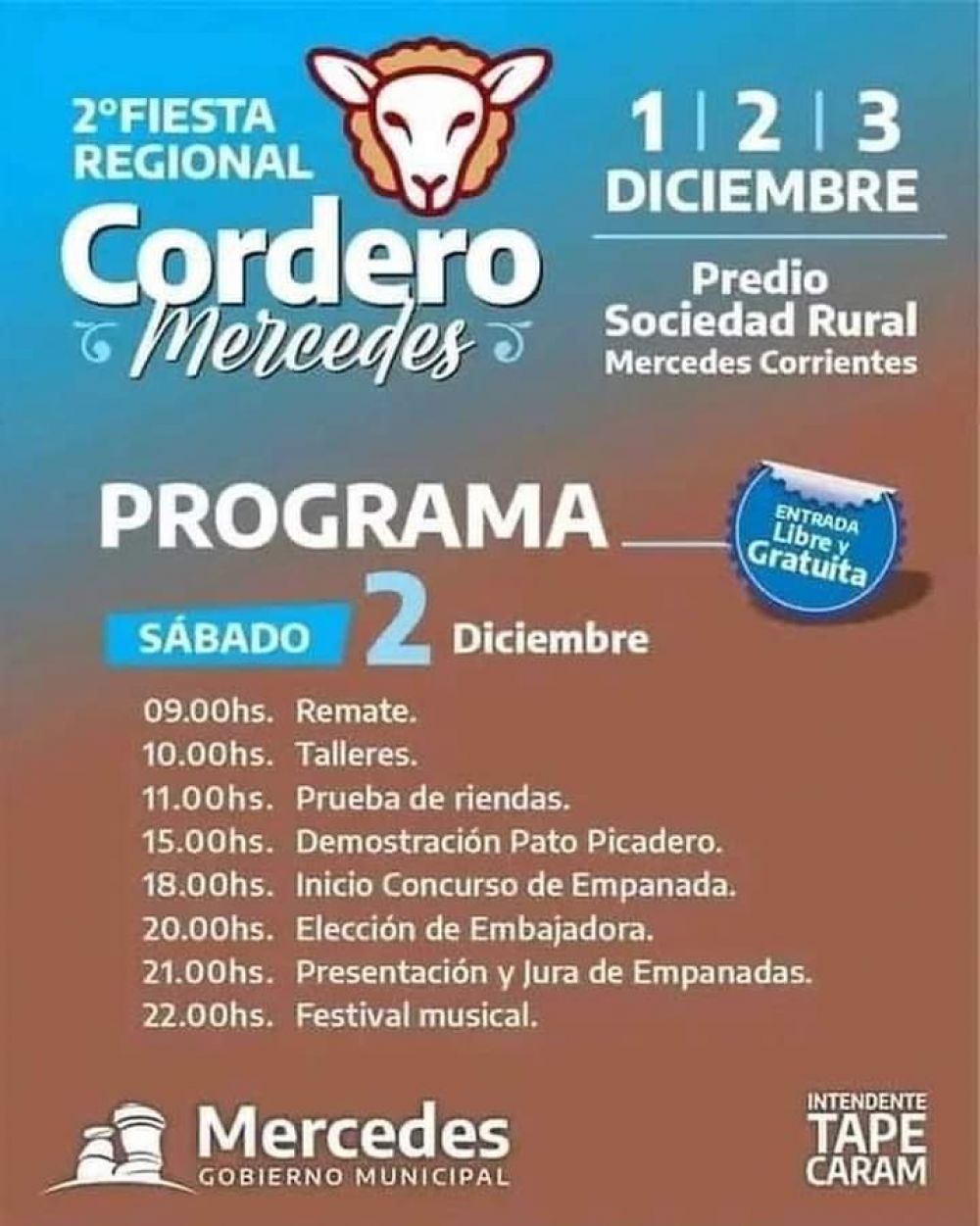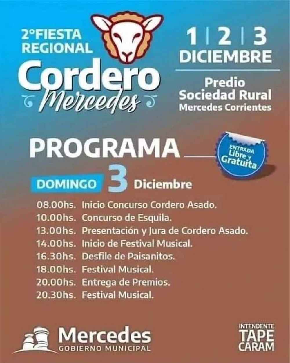El Gobierno Municipal de Mercedes invita a la 2° Fiesta Regional del Cordero Mercedeño, a realizarse los días viernes 1, sábado 2 y domingo 3 de diciembre, en el Predio de la Sociedad Rural.La entrada es libre y gratuita.