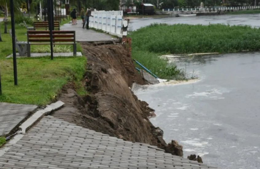 Cerca de las 15.30, parte de la costanera de la localidad de Esquina quedó bajo agua tras desmoronarse debido a las intensas lluvias. La información fue confirmada por fuentes oficiales y, además, circularon distintos videos por redes sociales del momento justo cuando la construcción iba cediendo ante el agua.