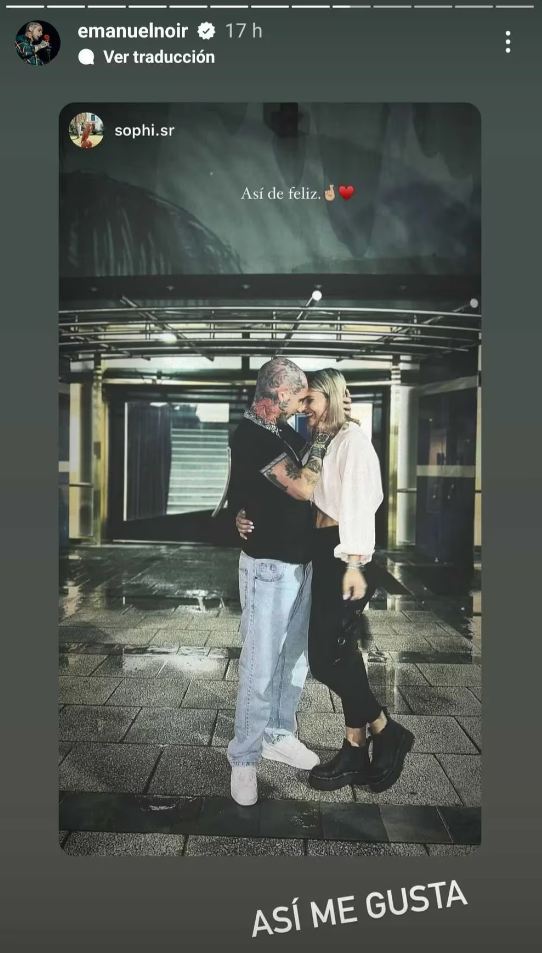 El último miércoles el cantante compartió en sus historias de Instagram una foto familiar con un enorme árbol de Navidad de fondo. Dentro del numeroso grupo se destaca la modelo, quien ya habría sido presentada al círculo íntimo de Noir. Y un rato después, Sophia subió a su perfil una foto junto a Emanuel en la que se los ve abrazados y riendo. “Así de feliz”, definió ella junto a dos emoticones, uno de dos dedos cruzados y otra de un corazón rojo. El líder de Ke Personajes le devolvió el gesto compartiendo esta story en su perfil de la misma red social y le agregó una rotunda leyenda: “Así me gusta”.