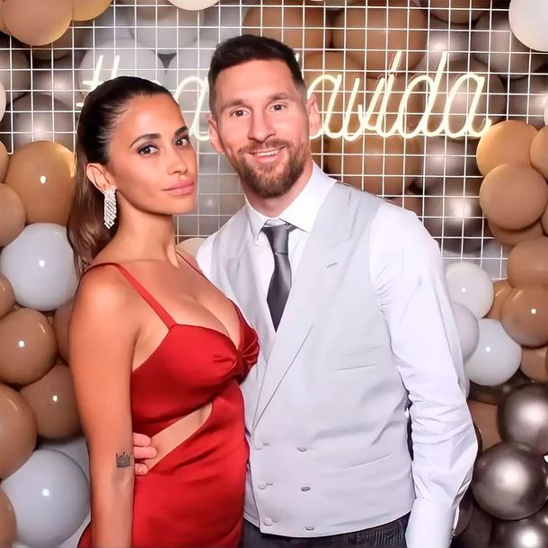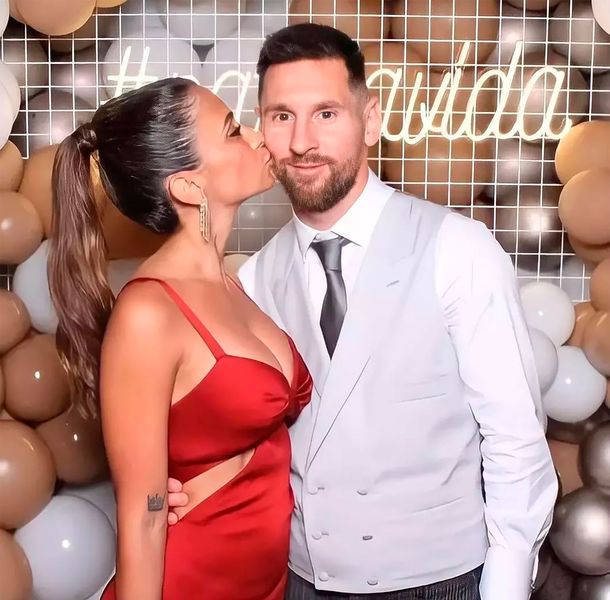 Según puede observarse en esas fotografías, Antonela lució un vestido escotado rojo escarlata, con una abertura en los costados, con un peinado con cola de caballo y joyas doradas en sus manos y aros de oro blanco.
