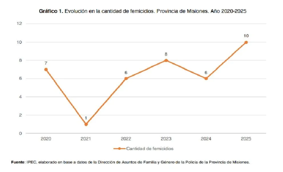 La provincia de Misiones registró un aumento significativo en la tasa de femicidios entre 2023 y 2025, según el último informe del Observatorio de Violencia Familiar y de Género. Hasta la fecha de publicación del reporte -que fue el pasado 13 de noviembre- se habían contabilizado 10 femicidios en el territorio provincial, lo que refleja un incremento del 67% respecto de 2024 y del 25% en relación con 2023.