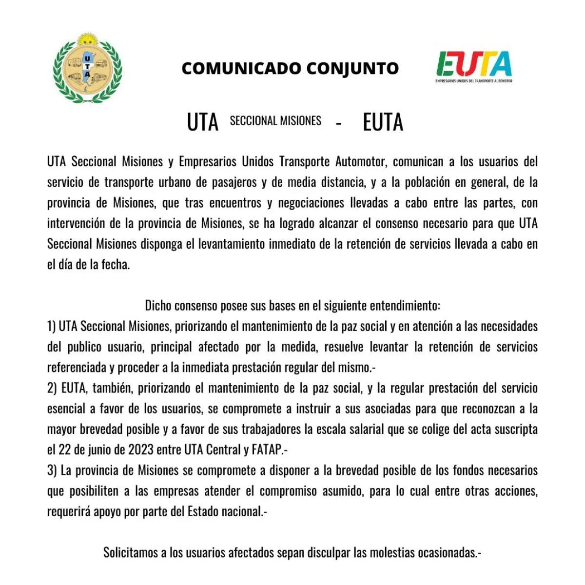 En un comunicado en conjunto entre UTA Misiones y los Empresarios Unidos Transporte Automotor (EUTA), que agrupa a la mayoría de las empresas de transporte público de Posadas, afirmaron que “tras encuentros y negociaciones llevadas a cabo entre las partes, con intervención de la provincia de Misiones, se ha logrado alcanzar el consenso necesario para que UTA Seccional Misiones disponga el levantamiento inmediato de la retención de servicios llevado a cabo en el día de la fecha”.