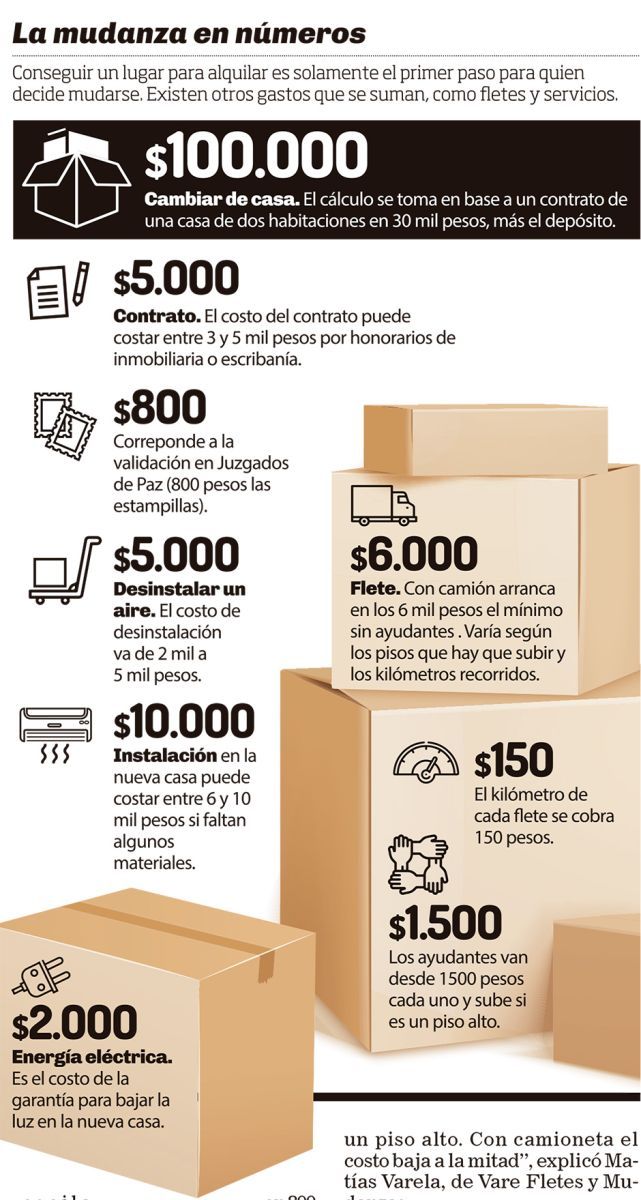 “El precio de mudanza varía de acuerdo si hay muchos muebles que transportar. Con camión arranca en los 6 mil pesos el mínimo sin ayudantes y ahí varía de qué piso hay que subir y los kilómetros recorridos. El kilómetro se cobra 150 pesos. Los ayudantes van desde 1.500 pesos cada uno y sube si es un piso alto. Con camioneta el costo baja a la mitad”, explicó Matías Varela, de Vare Fletes y Mudanzas.