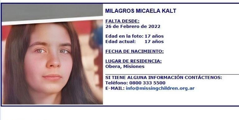 Milagros Micaela Kalt, de 17 años, desapareció el pasado sábado 26 de febrero en Oberá. Salió de su casa en el barrio Villa Christen y desde entonces su paradero es un misterio. Ya transcurrieron 95 días pero no existen datos ni evidencias concretas que permitan hallarla.