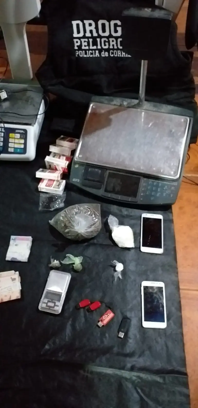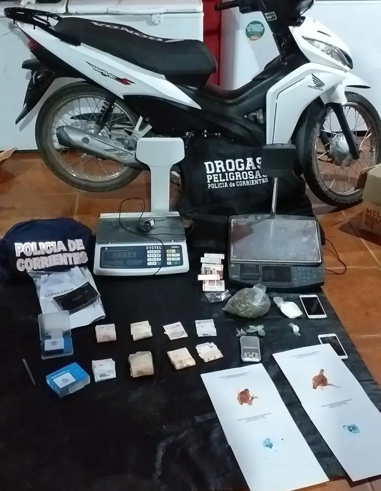 Además se secuestró una moto, el monto total de $70.190, 3 balanzas, 2 celulares, y elementos de cortes con bolsas de polietileno tijera, cuchara.
