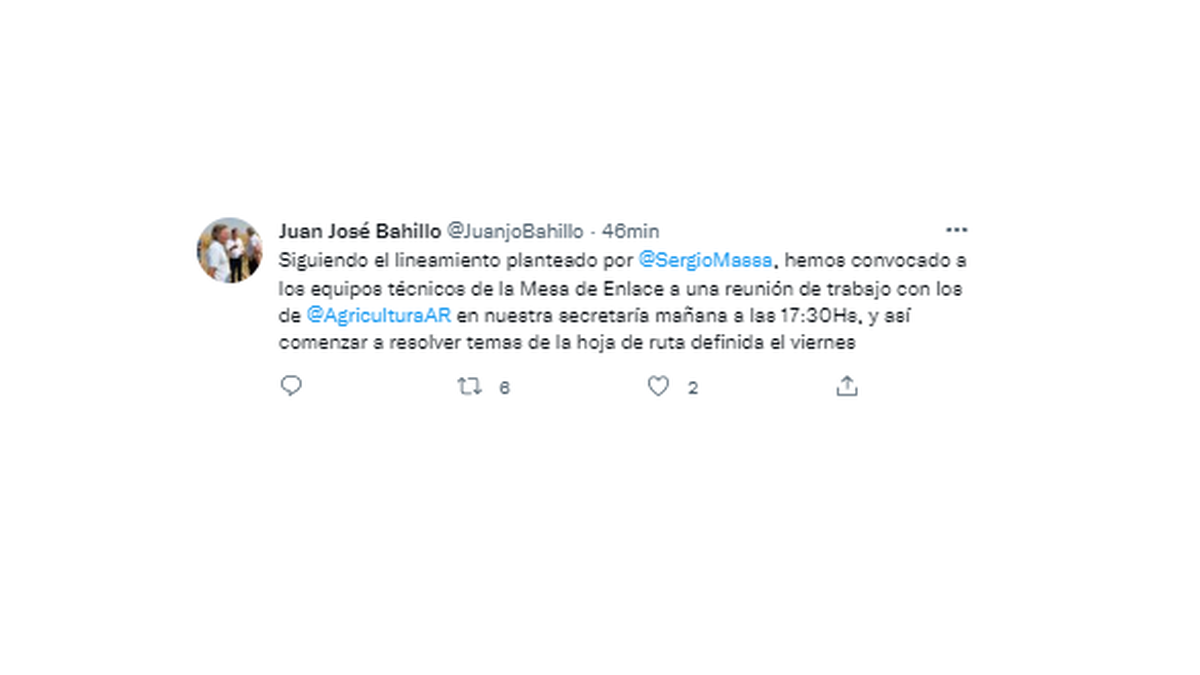 "Siguiendo el lineamiento planteado por SergioMassa, hemos convocado a los equipos técnicos de la Mesa de Enlace a una reunión de trabajo con los de AgriculturaAR en nuestra secretaría mañana a las 17:30Hs, y así comenzar a resolver temas de la hoja de ruta definida el viernes", escribió el funcionario en la red social.
