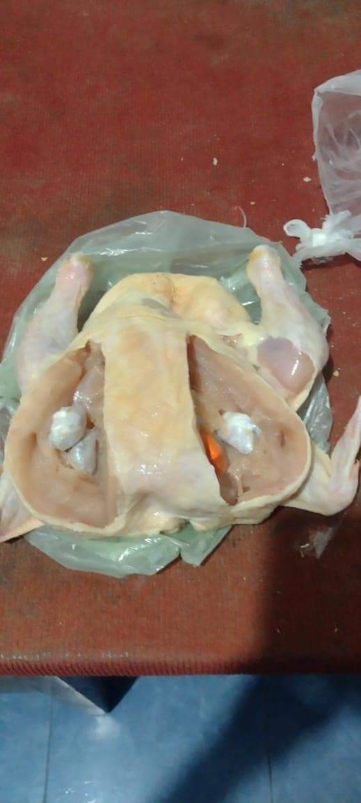 Al momento de que los agentes inspeccionan minuciosamente los elementos que llevó el muchacho observan, dentro de un pollo crudo, 5 envoltorios con marihuana, que arrojaron un peso de 15 gramos, y también, dentro de un globo color naranja, hallaron una bochita con 3 gramos de cocaína.